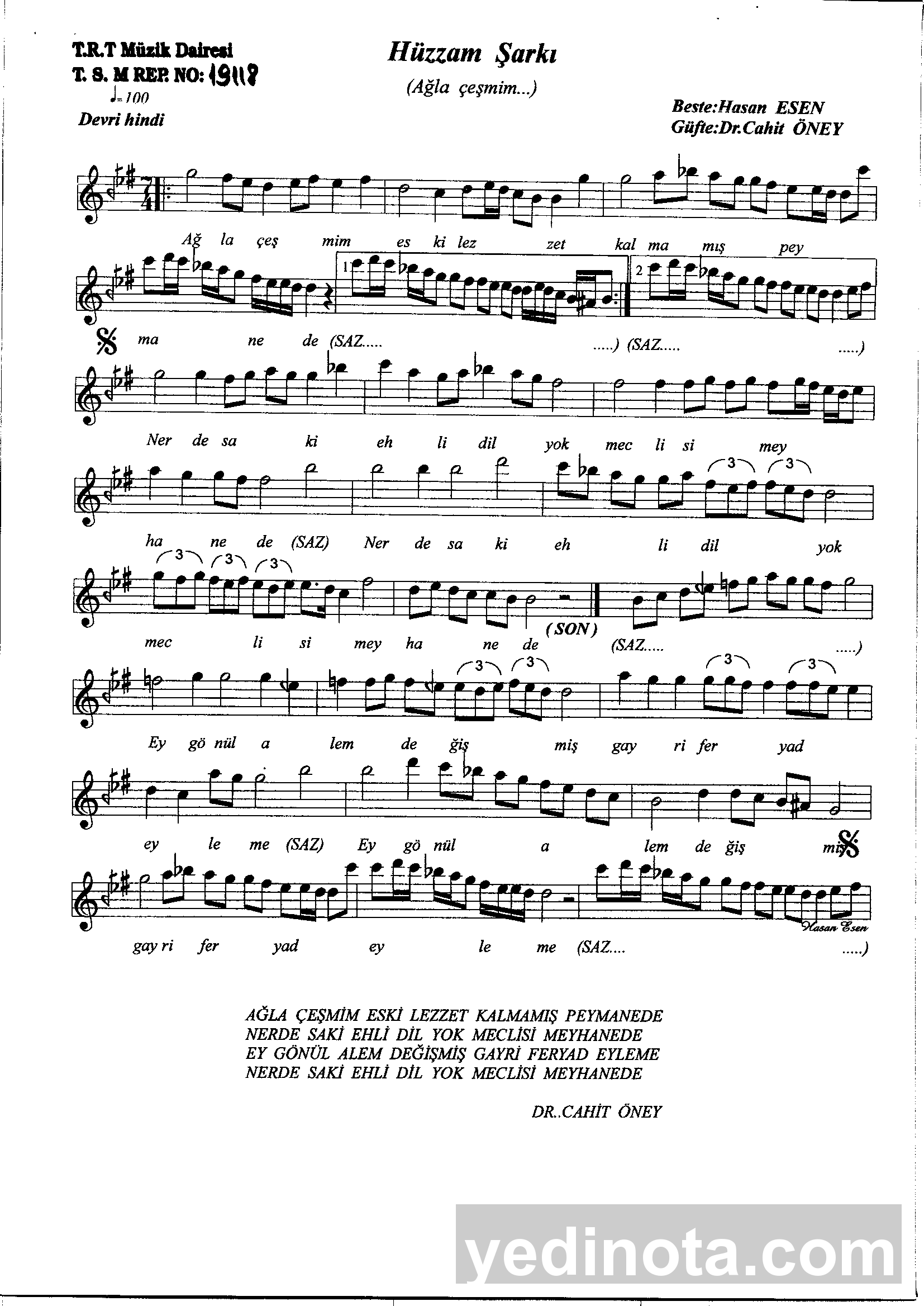 TRT Repertuar Numarası:19118BestekarıHasan EsenSöz YazarıCahit ÖneyMakamıHüzzamUsulüDevr-i HindiFormuŞarkı