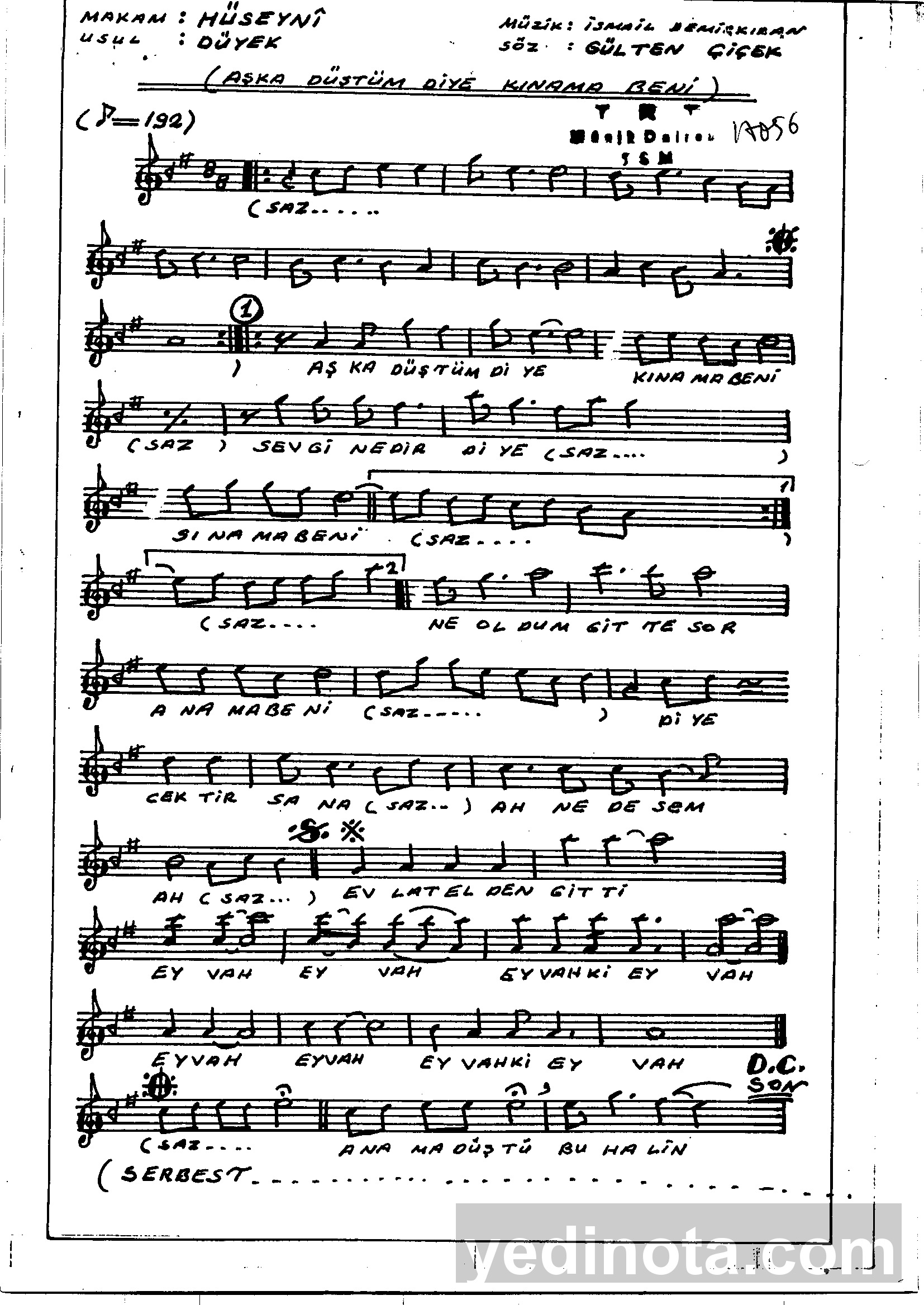 TRT Repertuar Numarası:17056Bestekarıİsmail DemirkıranSöz YazarıGülten Çiçek TuralMakamıHüseyniUsulüDüyekFormuŞarkı