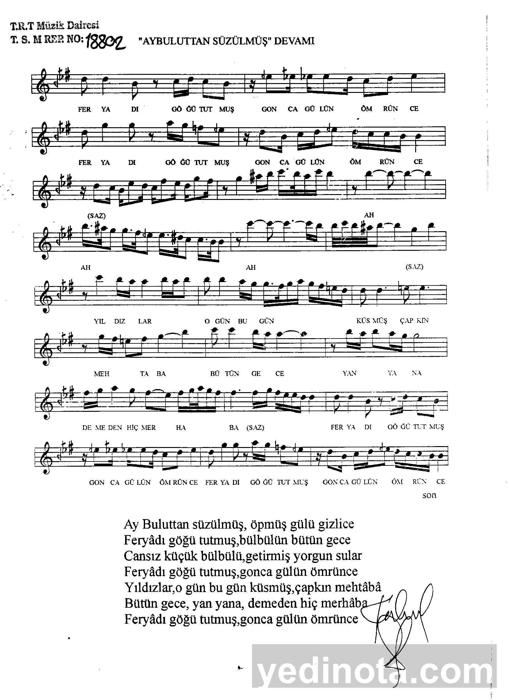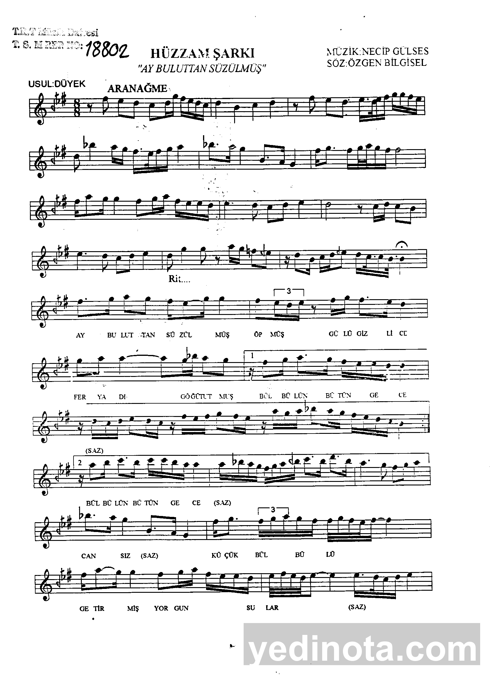 TRT Repertuar Numarası:18802BestekarıNecip GülsesSöz YazarıÖzgen BilgiselMakamıHüzzamUsulüDüyekFormuŞarkı