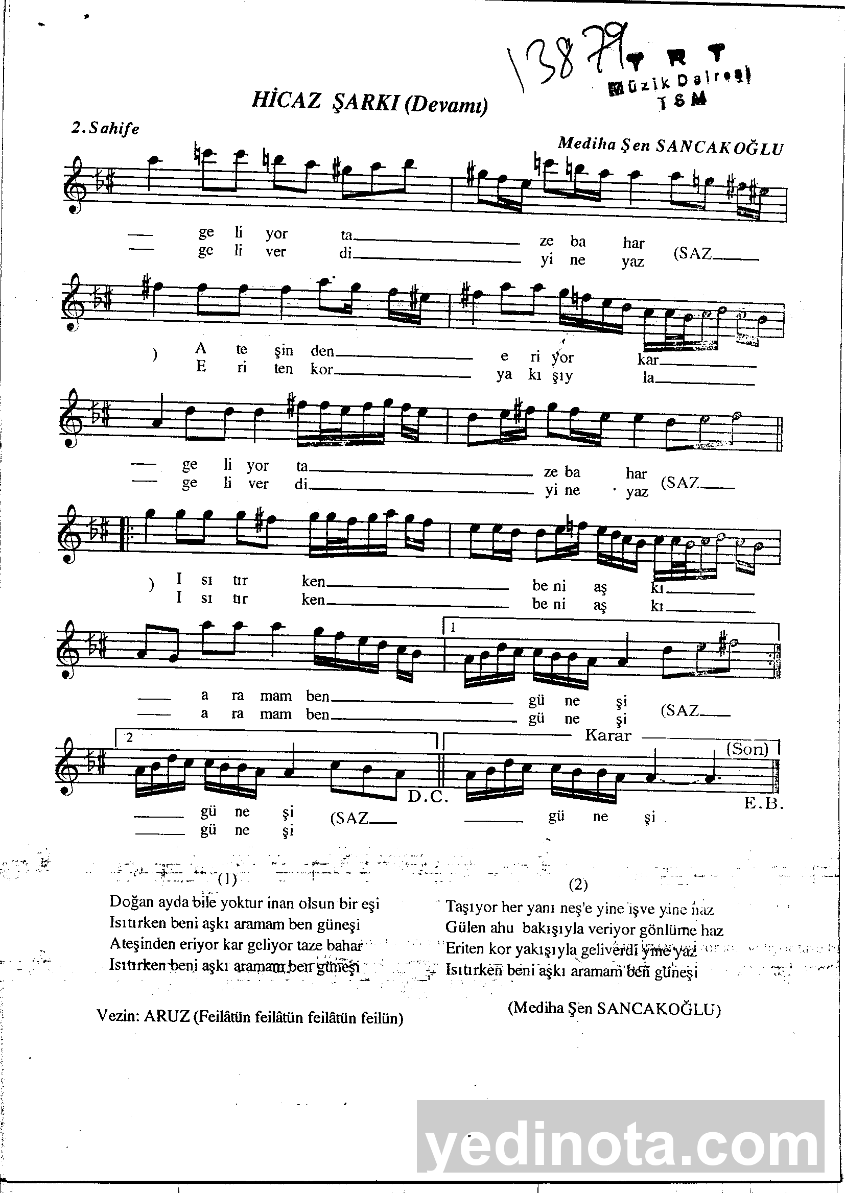 TRT Repertuar Numarası:13879BestekarıMediha Şen SancakoğluSöz YazarıMediha Şen SancakoğluMakamıHicazUsulüAksakFormuŞarkı