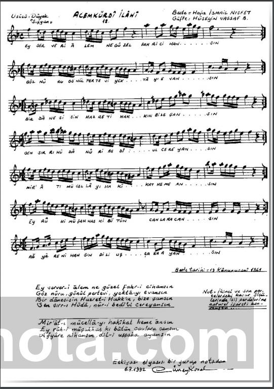 TRT Repertuar Numarası:14143Bestekarıİsmail Nısfet(Hafız)Söz YazarıHüseyin Vassaf BeyMakamıAcemkürdiUsulüSofyanFormuİlahi