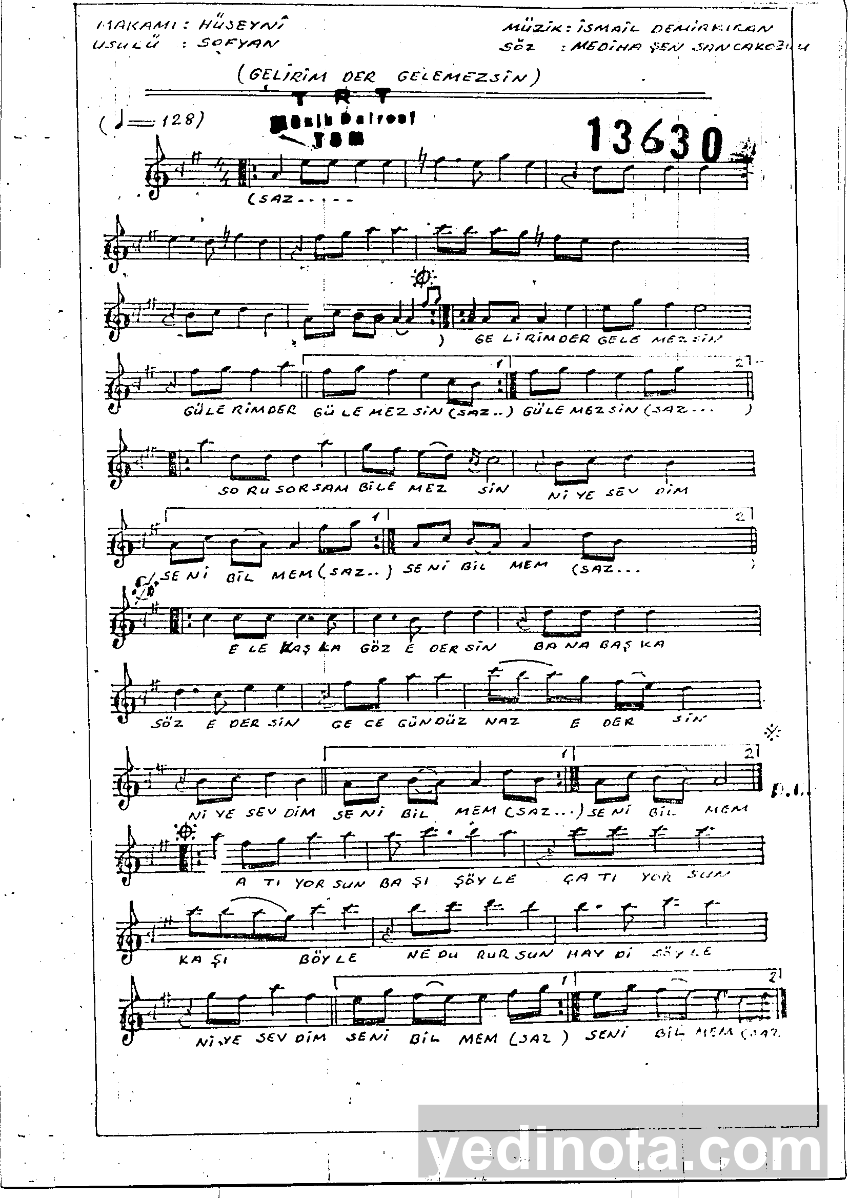 TRT Repertuar Numarası:13630Bestekarıİsmail DemirkıranSöz YazarıMediha Şen SancakoğluMakamıHüseyniUsulüSofyanFormuŞarkı
