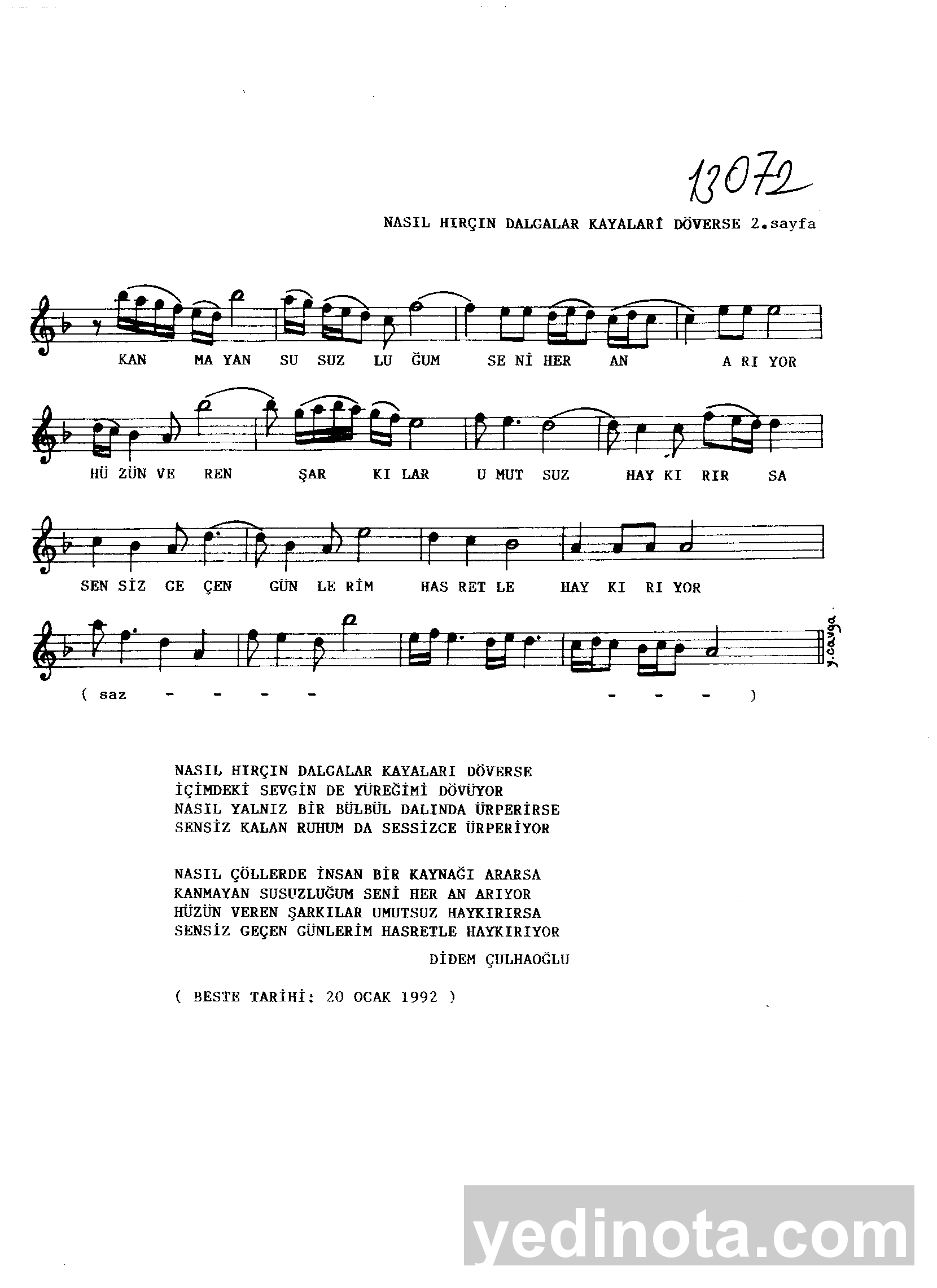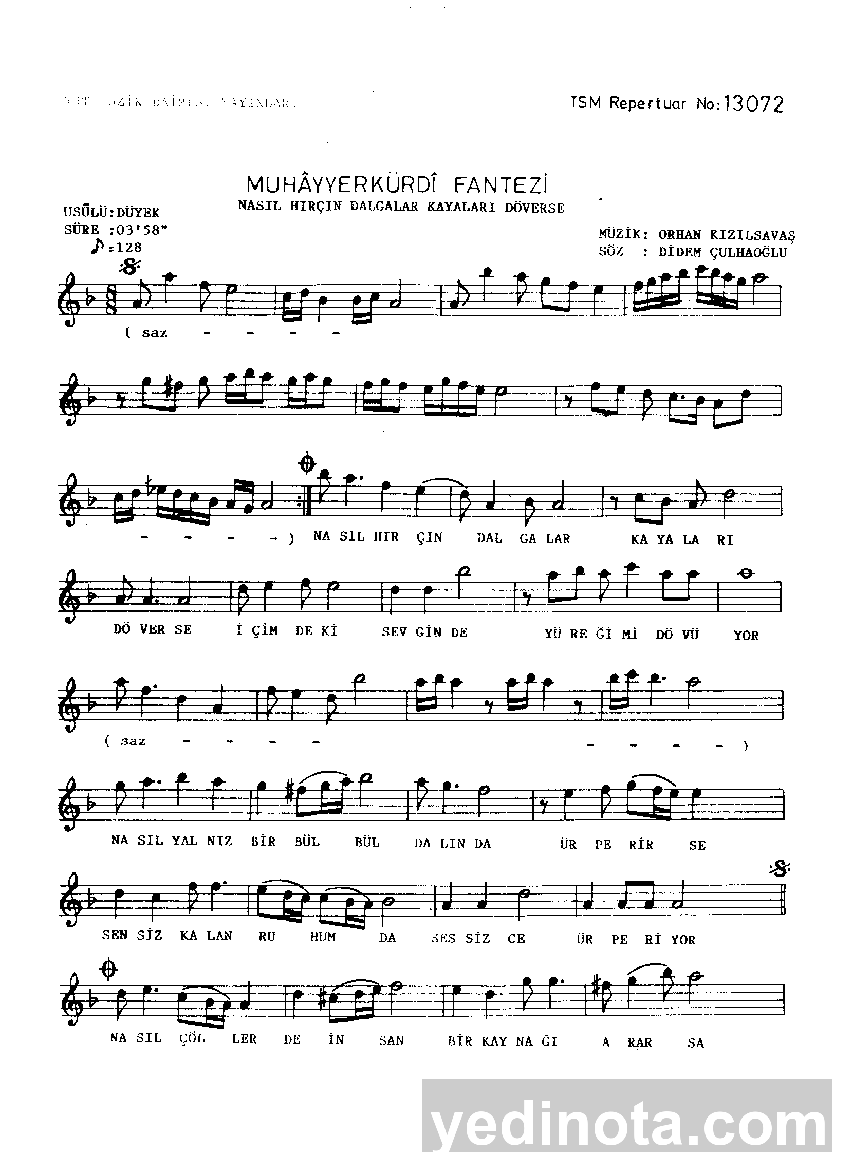 TRT Repertuar Numarası:13072BestekarıOrhan KızılsavaşSöz YazarıDidem ÇulhaoğluMakamıMuhayyer KürdıUsulüDüyekFormuFantezi