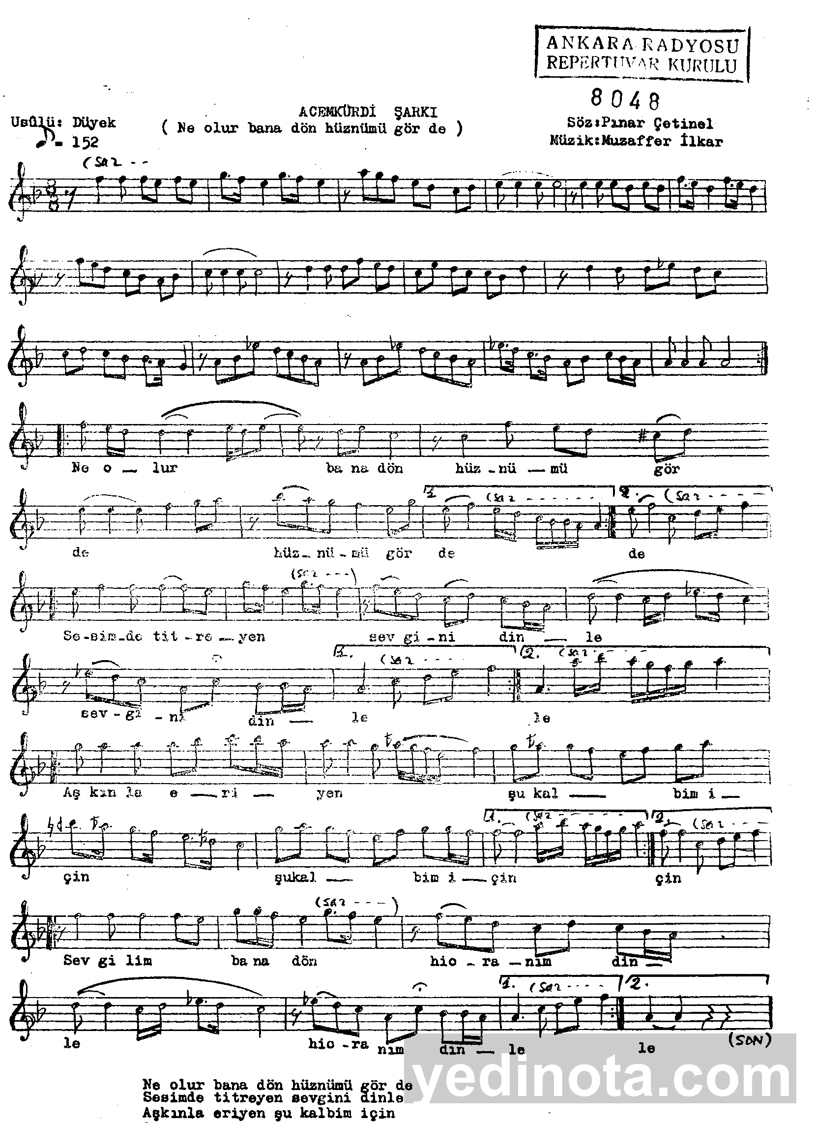 TRT Repertuar Numarası:8048BestekarıMuzaffer İlkarSöz YazarıPınar ÇetinelMakamıAcemkürdiUsulüDüyekFormuŞarkı
