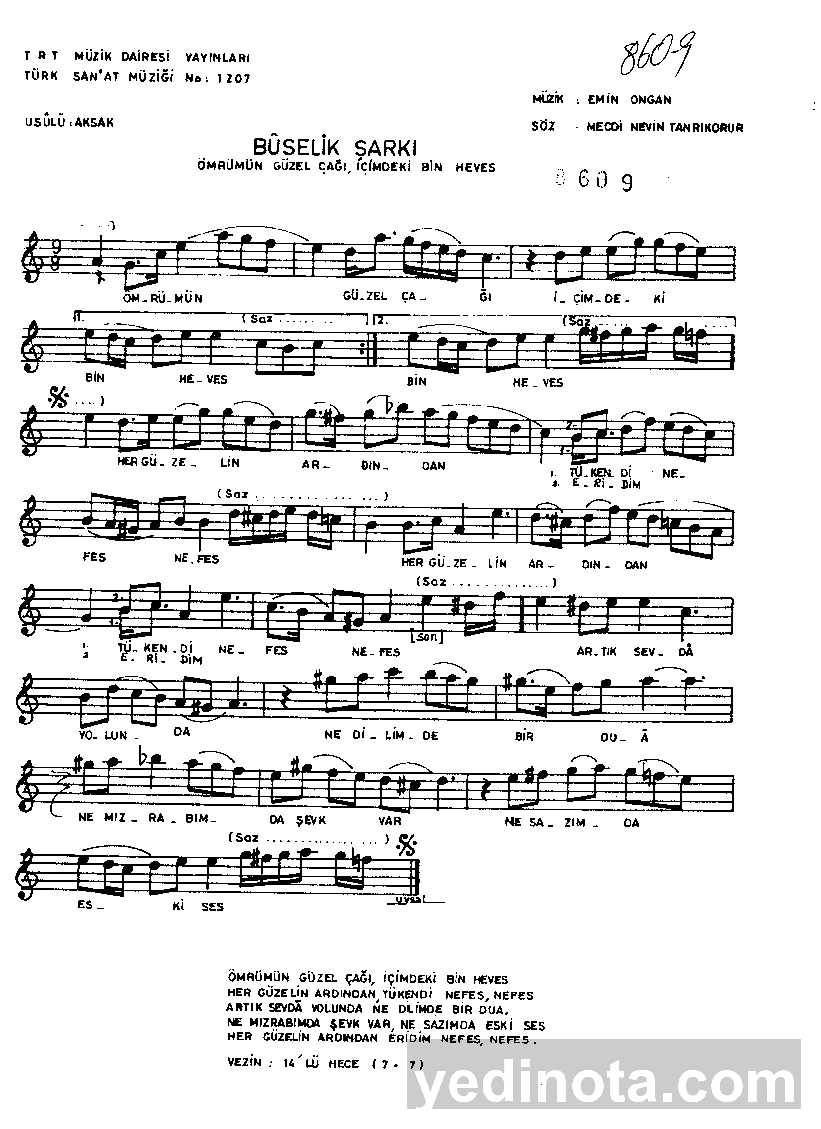 TRT Repertuar Numarası:8609BestekarıEmin OnganSöz YazarıMecdinevin TanrıkorurMakamıBuselikUsulüAksakFormuŞarkı
