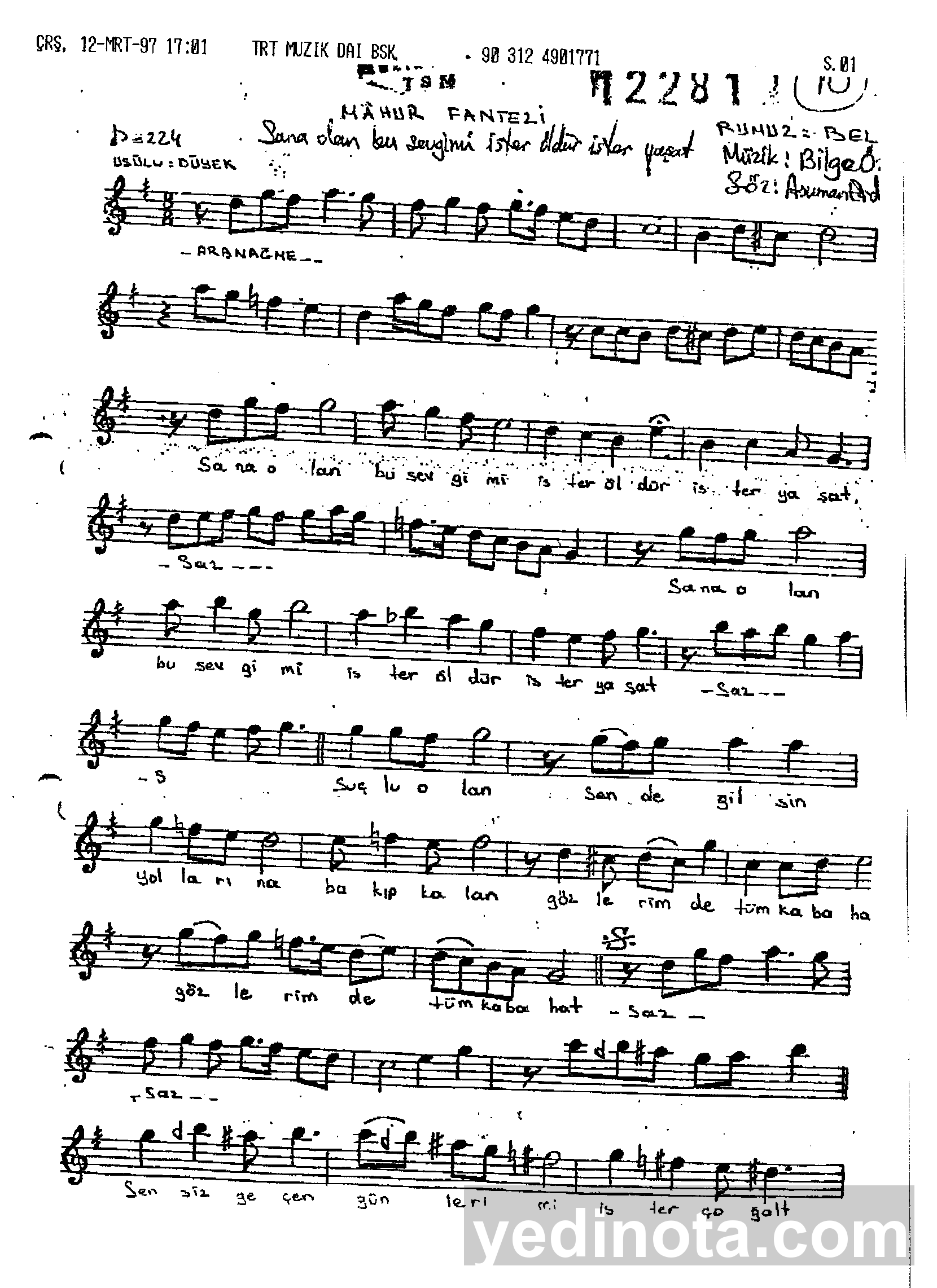 TRT Repertuar Numarası:12281BestekarıBilge ÖzgenSöz YazarıAsuman ErdemliMakamıMahurUsulüDüyekFormuŞarkı