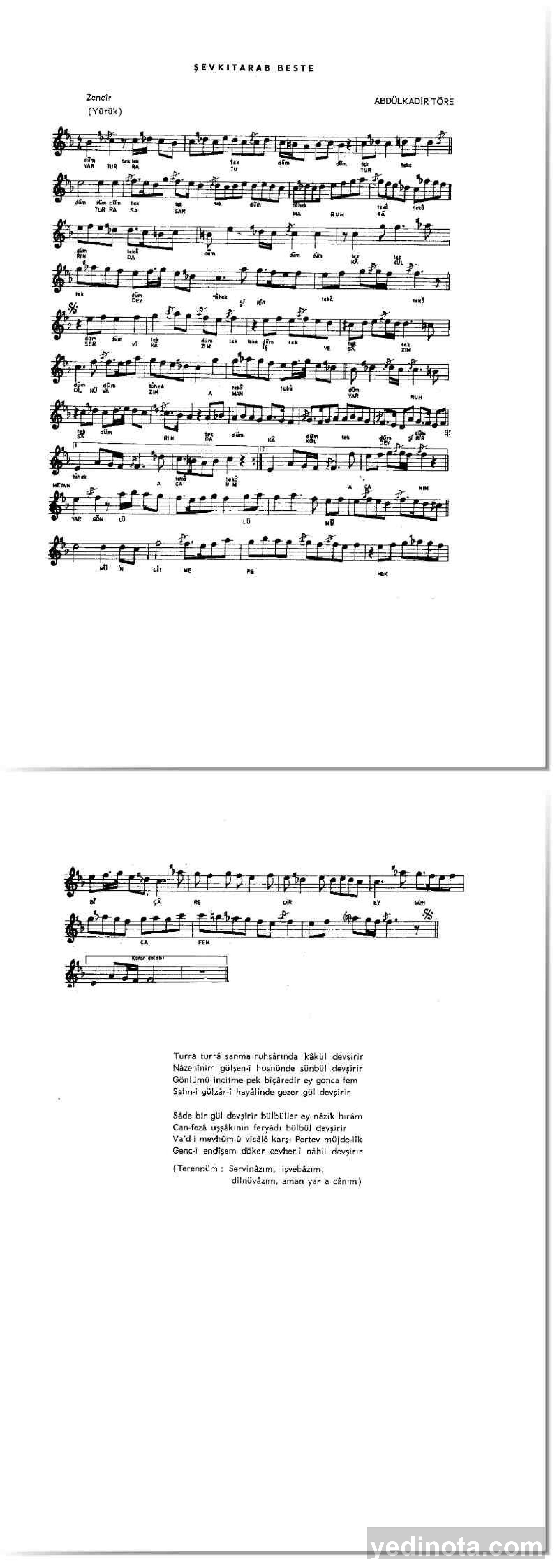 TRT Repertuar Numarası:10715BestekarıAbdülkadir TöreSöz YazarıMahmut BeyMakamıŞevkutarabUsulüZincirFormuBeste