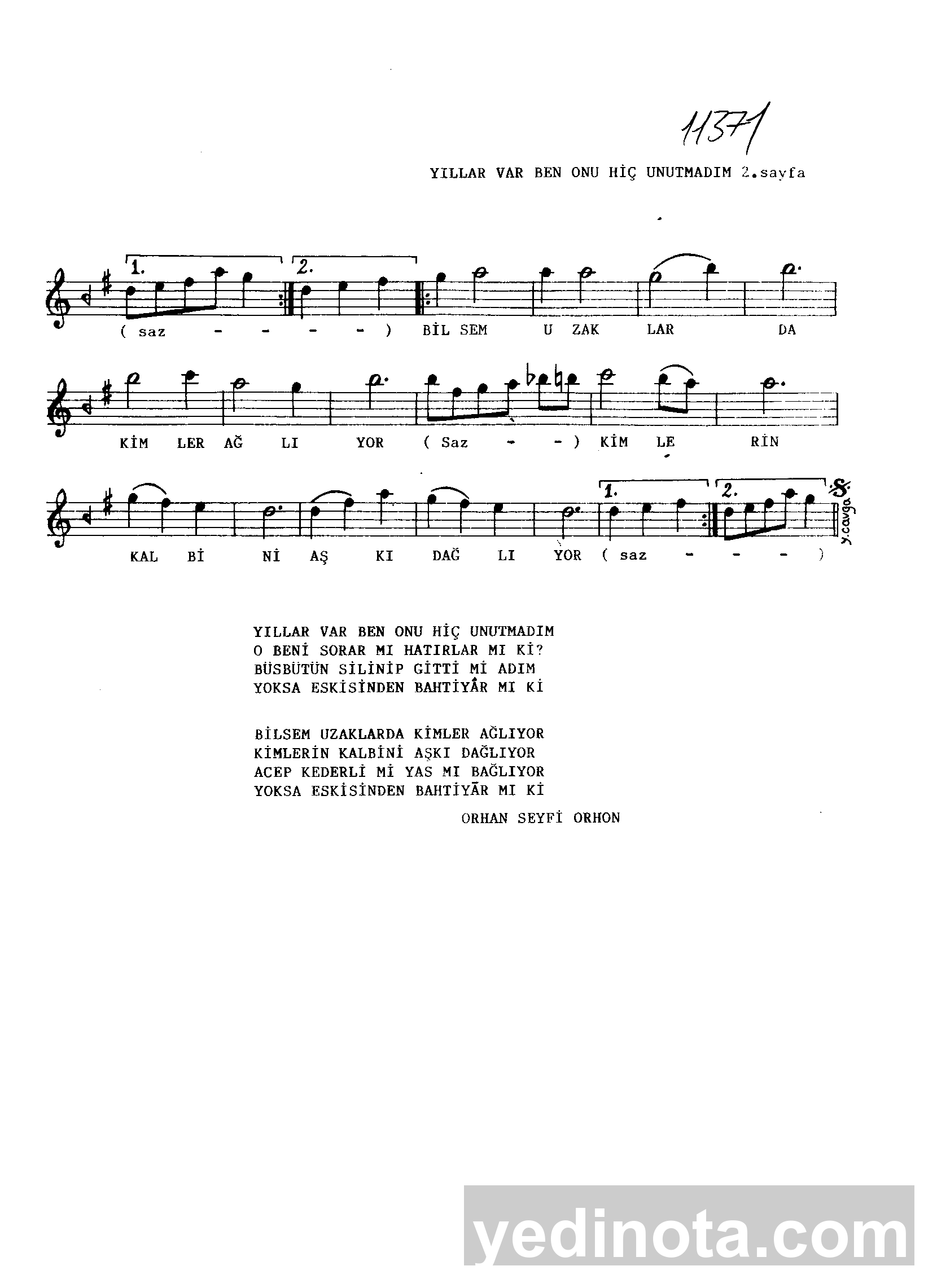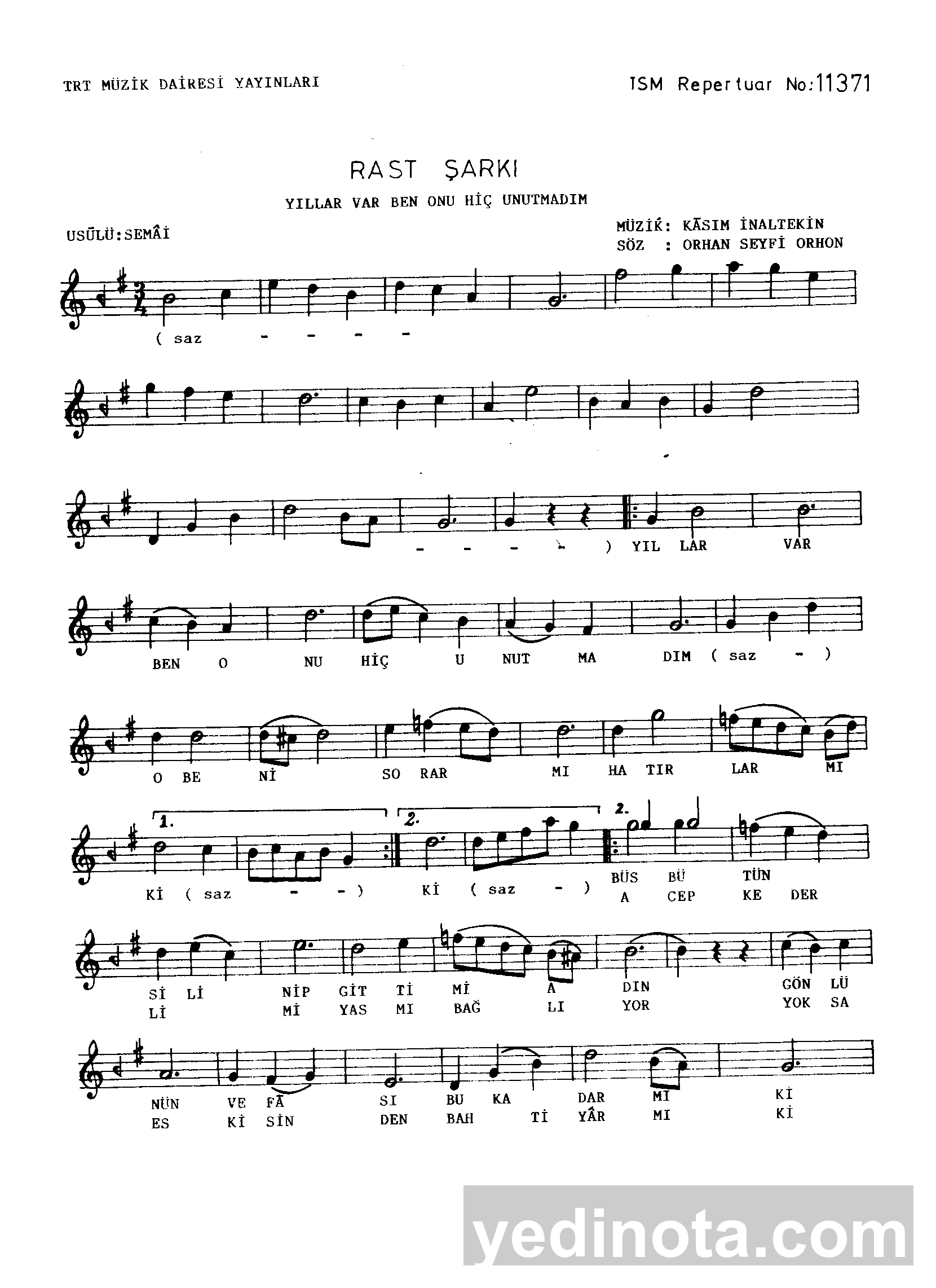 TRT Repertuar Numarası:11371BestekarıKasım İnaltekinSöz YazarıOrhan Seyfi OrhonMakamıRastUsulüSemaıFormuŞarkı