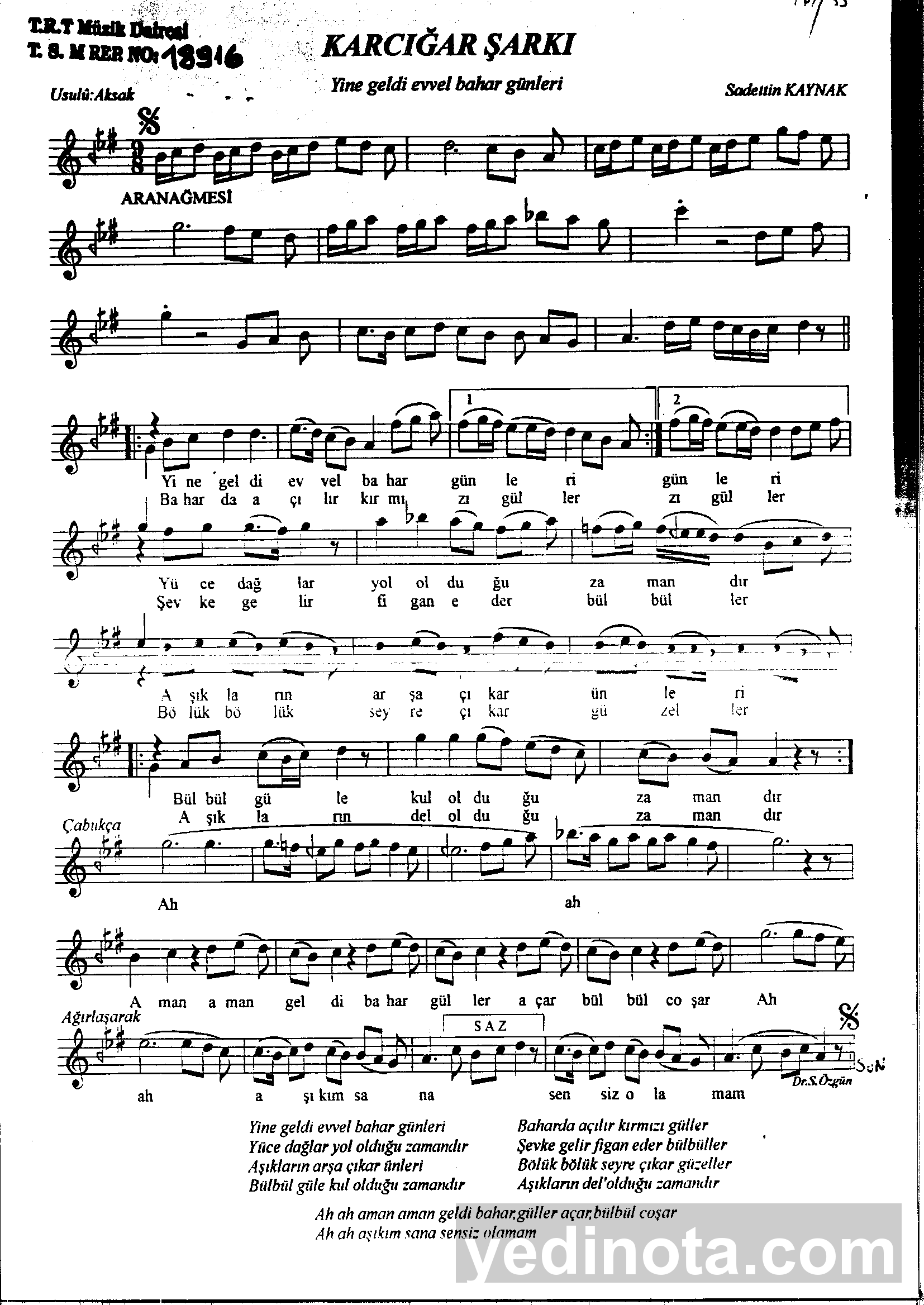 TRT Repertuar Numarası:18916BestekarıSadettin KaynakSöz YazarıKaracaoğlanMakamıKarcığarUsulüAksakFormuŞarkı